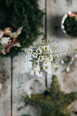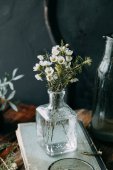 Zdjęcie "Wiosennych kwiatów i zieleni w wystrój na stole, w szklanych butelek z wodą i kropelki na szybie. Ciepły gamma i powściągliwy skład, z małych kwiatów i traw, na ciemnym tle drewnianych" może być wykorzystywane do celów osobistych i komercyjnych zgodnie z warunkami zakupionej licencji Royalty-free. Obraz jest dostępny do pobrania w jakości wysokiej rozdzielczości do 5760x3840.