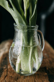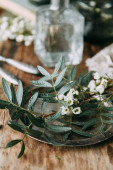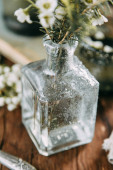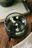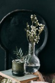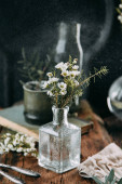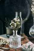 Wiosennych kwiatów i zieleni w wystrój na stole, w szklanych butelek z wodą i kropelki na szybie. Ciepły gamma i powściągliwy skład, z małych kwiatów i traw, na ciemnym tle drewnianych