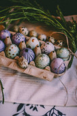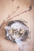 Ciastko Wielkanoc wiosna wykonane z ciasta drożdże, cukier puder, kropi i rodzynki. Otoczony przez wystrój i siana, na podłoże drewniane