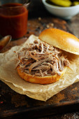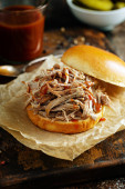 Zdjęcie "Wyciągnął kanapkę wieprzowe z grilla, sos" może być wykorzystywane do celów osobistych i komercyjnych zgodnie z warunkami zakupionej licencji Royalty-free. Obraz jest dostępny do pobrania w jakości wysokiej rozdzielczości do 5760x3840.