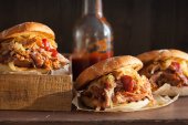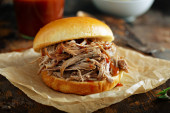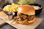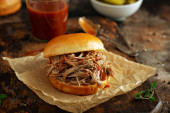 Wyciągnął kanapkę wieprzowe z grilla, sos