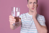 Młody człowiek z wrażliwych zębów i szklankę zimnej wody na kolor tła