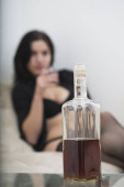 Ładne butelki whisky na stole i sexy dziewczyna w czarnym wyzywającą bieliznę na tle rozmazany