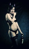 Młode seksowne kobiety w czarnej bieliźnie rośnie jej rękę z butelki o