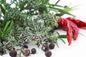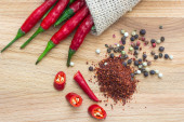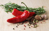 Papryka chili i zielona cebula z przyprawami na białym tle drewnianych.