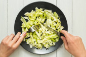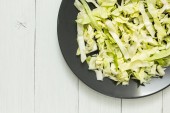Szef świeżej kapusty organicznych na talerzu, nóż i widelec. Biały drewniany stół.