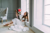 Zdjęcie "Młoda piękna panna młoda w buduar i sukni ślubnej, z wieniec i bukiet w jej ręce. Londyn ślub trendy, stylowe photoshoot" może być wykorzystywane do celów osobistych i komercyjnych zgodnie z warunkami zakupionej licencji Royalty-free. Obraz jest dostępny do pobrania w jakości wysokiej rozdzielczości do 5760x3840.