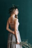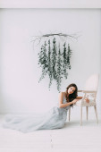 Młoda piękna panna młoda w buduar i sukni ślubnej, z wieniec i bukiet w jej ręce. Londyn ślub trendy, stylowe photoshoot