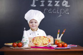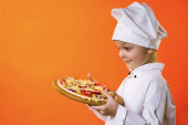 Szef kuchni śmieszne gotowane spicy pizza z chili na pomarańczowym tle