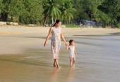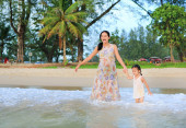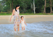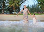 Matka i córka relaks na plaży o zachodzie słońca.
