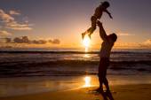 Sylwetka ojciec jechały szyi prowadzi córka wygląd w morze o zachodzie słońca.