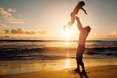 Sylwetka ojca rzucanie małe dziecko dziewczyna na plaży o zachodzie słońca.