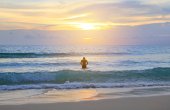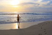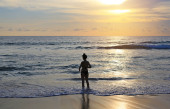 Matka i córka relaks na plaży o zachodzie słońca.
