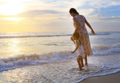 Matka i córka relaks na plaży o zachodzie słońca.