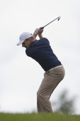 Azjatycka golfista swinging klub dla tee off w złoty kurs w okresie letnim
