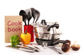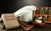 Kompozycja z kuchni kapelusz i kitchenwear na stole na szarym tle