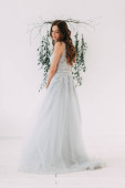 Pięknej młodej w buduar strój na tle płótnie farbą. Ślubne trendy i pomysły 2018, Wiosenne inspiracje. Ślub w Studio