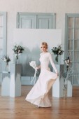 Pięknej młodej w buduar strój na tle płótnie farbą. Ślubne trendy i pomysły 2018, Wiosenne inspiracje. Ślub w Studio