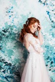 Pięknej młodej w buduar strój na tle płótnie farbą. Ślubne trendy i pomysły 2018, Wiosenne inspiracje. Ślub w Studio