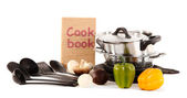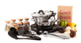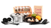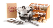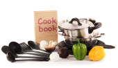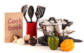 kompozycja kuchnia narzędzia i warzywa na białym tle