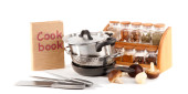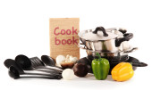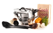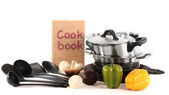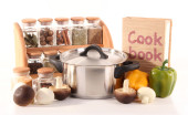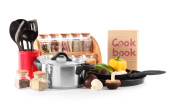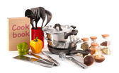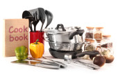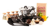 skład narzędzia kuchenne, przyprawy i warzywa na białym tle