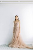 Pięknej młodej w buduar strój na tle płótnie farbą. Ślubne trendy i pomysły 2018, Wiosenne inspiracje. Ślub w Studio