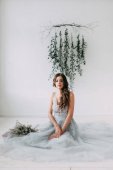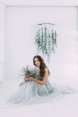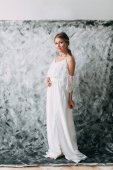 Pięknej młodej w sukni ślubnej na płótnie tła z obrazu pastelowych, delikatne jasne kolory. Powściągliwy gamma i nowoczesne trendy w fotografii