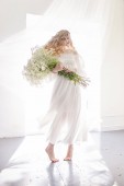 Panna Młoda w światło ślub sukienka z bukietem czerwonych kwiatów, na ścianie w stylu skandynawskim. Europejskiej ślubu, nowoczesne trendy i inspiracje