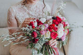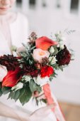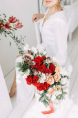 Zdjęcie "Panna Młoda w światło ślub sukienka z bukietem czerwonych kwiatów, na ścianie w stylu skandynawskim. Europejskiej ślubu, nowoczesne trendy i inspiracje" może być wykorzystywane do celów osobistych i komercyjnych zgodnie z warunkami zakupionej licencji Royalty-free. Obraz jest dostępny do pobrania w jakości wysokiej rozdzielczości do 5760x3840.