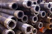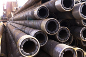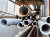 Rury w magazynie produkcji są rozmieszczone na półkach