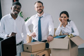 wieloetniczny współpracowników gospodarstwa kartony i uśmiechając się aparatu podczas relokacji