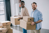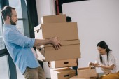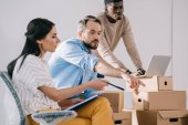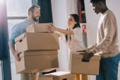 Młodzi ludzie wieloetnicznym tekturowe pojemniki transportowe podczas relokacji