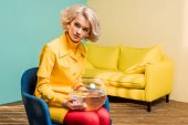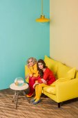 kobieta siedzi na kanapie żółty z ryb akwariowych na stolik w kolorowy apartament, koncepcja lalka domu w stylu retro