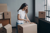 zamyślony młoda kobieta stojąc z ręki na podbródek i patrząc na kartony w nowym biurze