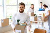 Zdjęcie "przystojny Brodaty mężczyzna trzyma kartony i uśmiechając się aparatu podczas przeprowadzki z koleżanka w nowym biurze" może być wykorzystywane do celów osobistych i komercyjnych zgodnie z warunkami zakupionej licencji Royalty-free. Obraz jest dostępny do pobrania w jakości wysokiej rozdzielczości do 5760x3840.