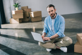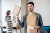 przystojny Brodaty mężczyzna trzyma kartony i uśmiechając się aparatu podczas przeprowadzki z koleżanka w nowym biurze