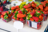 Kosz z świeże truskawki, jeżyny, borówki, maliny i porzeczki czerwone.