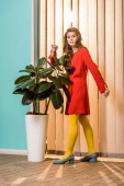 Widok z boku miło młodej kobiety w jasne ubrania o kolorowy pokój, koncepcja Dom lalki