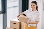 szczęśliwy Brodaty mężczyzna trzymając pudełka i uśmiechając się aparatu podczas relokacji