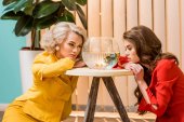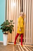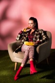 Kobieta rozmawia smartfonów na kanapie żółty, koncepcja domu lalki w stylu retro