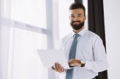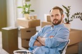 przystojny biznesmen z skrzyżowanymi rękami uśmiecha się do kamery w nowym biurze ozdobiony balony