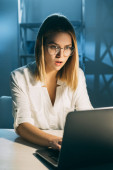 młodych myślących kobiet hakera, patrząc na ekranie komputera