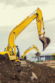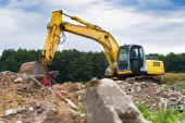 Koparka gąsienicowa na placu budowy. Na białym tle duża koparka pracy na budowie.