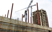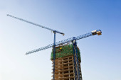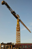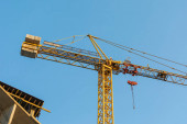 Na białym tle żurawia na miejscu. Niebieski dźwigu na budowie przeciw błękitne niebo w tle.