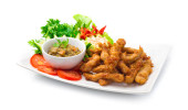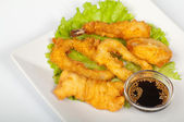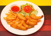 Shanghai kurczaka z dekoracji. Shanghai kurczaka na talerz z pieczonymi ziemniakami, kapusta Sałatka i pomidory plastry.