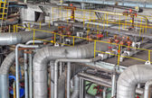Architektura wnętrz elektrociepłowni. Rury systemu do transportu ciepłej wody produkowane przez Kotły do elektrociepłowni.