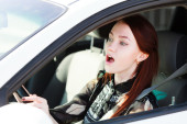 Zdjęcie "Młoda ładna kobieta kierowca jazda samochodem i kłócił się z kimś" może być wykorzystywane do celów osobistych i komercyjnych zgodnie z warunkami zakupionej licencji Royalty-free. Obraz jest dostępny do pobrania w jakości wysokiej rozdzielczości do 5760x3840.
