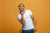Sukces wygrywając człowiek, szczęśliwy ekstatyczny obchodzi jest zwycięzcą. Dynamiczny obraz energiczny mężczyzna modelu