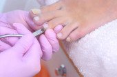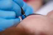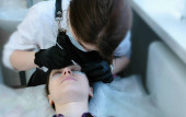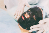 Kosmetyczka oddziela rzęsy z igłą i wygina je na wałki. Laminowanie Botox i rzęs. Widok z boku.