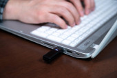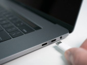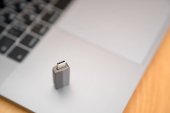 Szary Thunderbolt przejściówki Usb-C na klawiaturze szarości na tle laptopa. Technologie cyfrowe i obiektów.